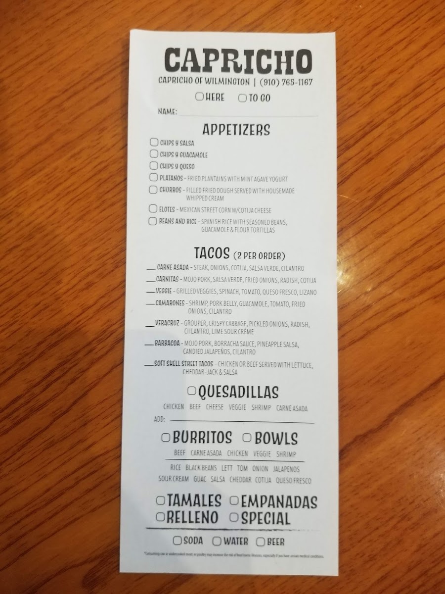 Welcome to Capricho, Wilmington's culinary gem, nestled at 215-A Princess St. Renowned for its authentic street tacos and delightful homemade churros, this vibrant eatery stands out for its dedication to quality and generosity in portions. Customers rave about the friendly staff who ensure a seamless ordering experience, making every visit memorable.